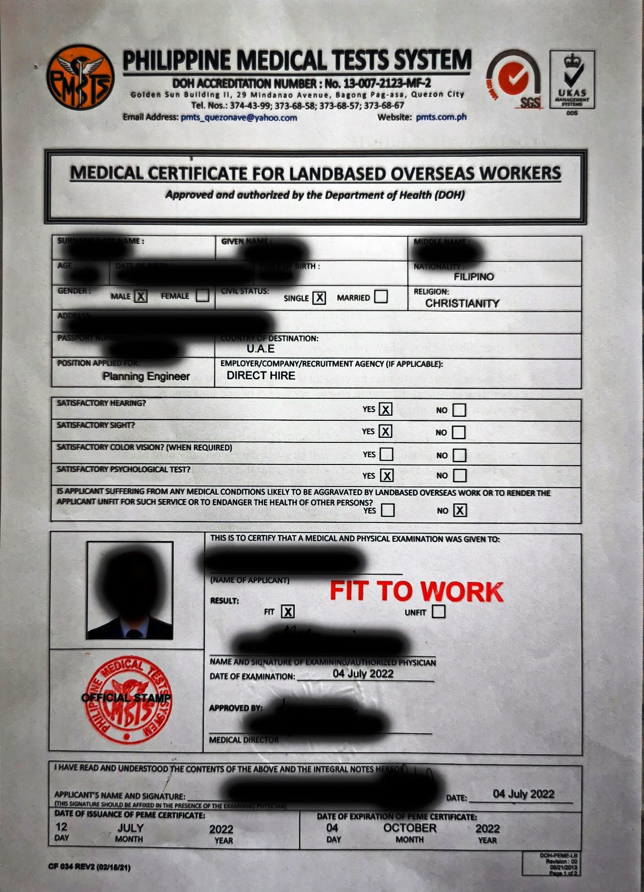 Pre-Employment Medical Exam Result (phase 1 only) Fit to work (July 2022)